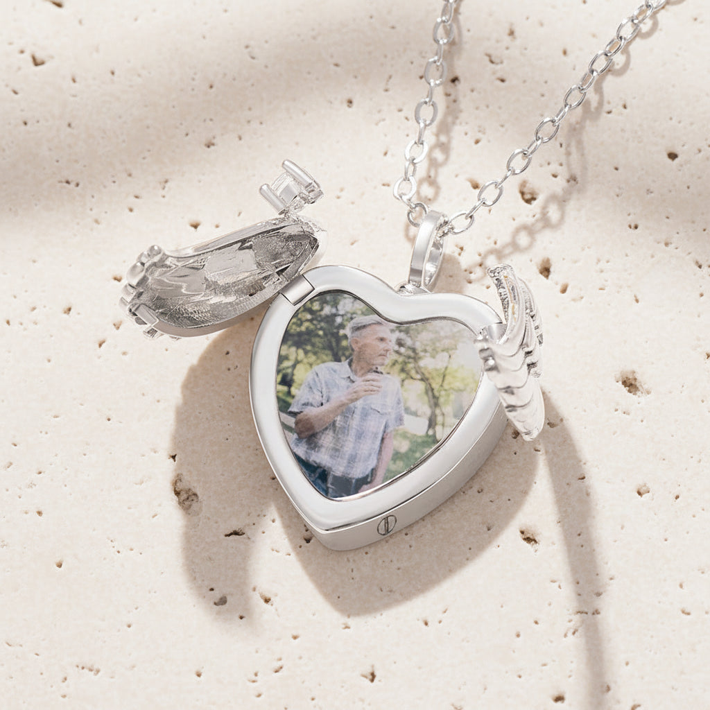 Carry cherished memories close with this elegant Angel Wings Photo Locket Urn Necklace. Designed with compassionate craftsmanship, this pendant combines a functional memorial urn with a photo locket, allowing you to honor loved ones in a meaningful way. The delicate angel wings motif symbolizes protection and eternal peace, while the secure locket compartment safely holds a small photograph or precious keepsake. Perfect for those seeking a dignified, wearable tribute that blends beauty with remembrance. An heirloom-quality piece that transforms grief into a tangible connection.