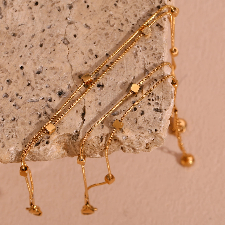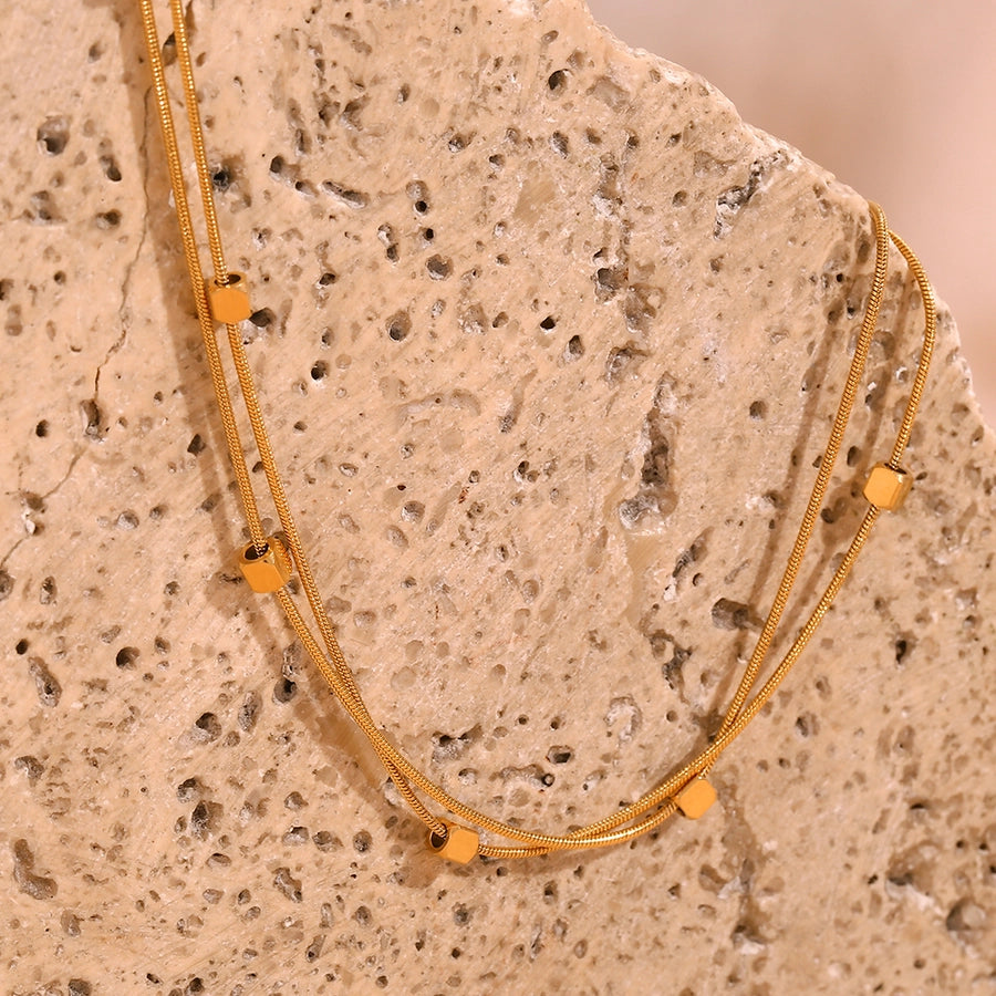 Adorn your ankle with the contemporary elegance of our Cube Double Layer Chain Anklet, meticulously crafted from durable stainless steel and finished with a radiant 18k gold coating. This anklet features a unique double layer design, showcasing two delicate chain strings adorned with tiny cube beads, exuding modern sophistication and style.