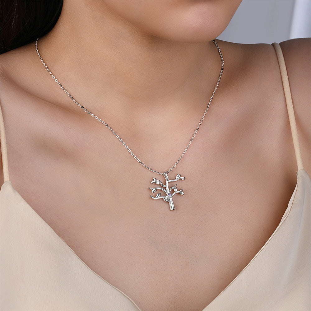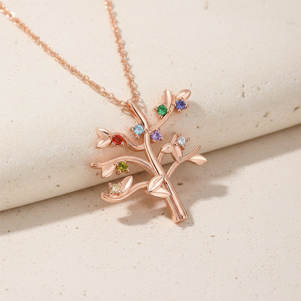 Celebrate your family's unique story with this elegant birthstone tree necklace. Each of up to eight delicate branches holds a genuine birthstone, representing the people you cherish most. Crafted with precision, this customizable pendant allows you to select specific birthstones and arrange them in a meaningful way. The tree design symbolizes growth, connection, and enduring bonds, making it a thoughtful gift for mothers, grandmothers, or anyone who treasures family. Available in sterling silver or gold-plated finishes, this versatile piece transitions seamlessly from everyday wear to special occasions. A timeless keepsake that tells your family's story.