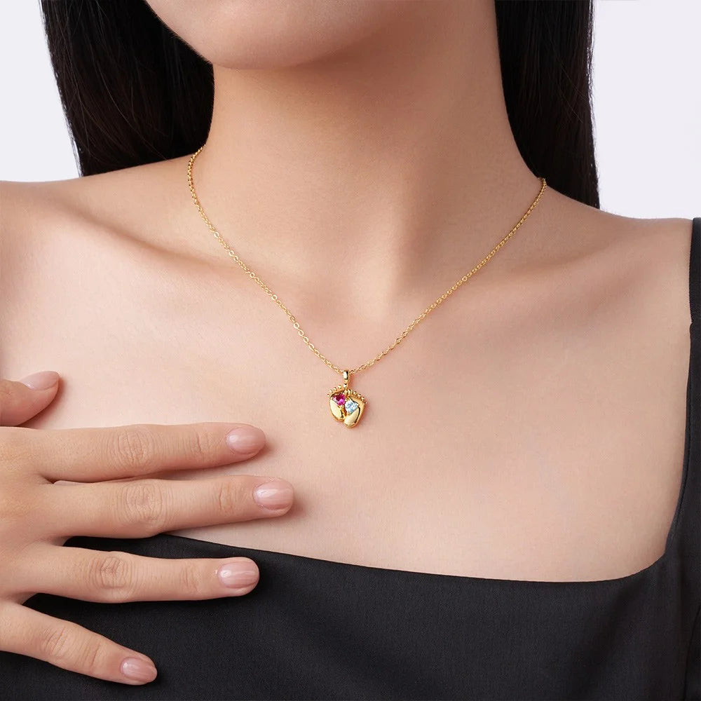Celebrate the arrival of your little ones with this elegant custom baby feet necklace, featuring two birthstones that honor their unique birth months. Crafted with precision, the delicate feet design symbolizes new beginnings and precious milestones. Each birthstone is carefully selected to represent your children, creating a meaningful keepsake that grows with your family. Perfect for new mothers or as a thoughtful gift for parents, this necklace combines sentimental value with timeless style. Wear your love close to your heart.