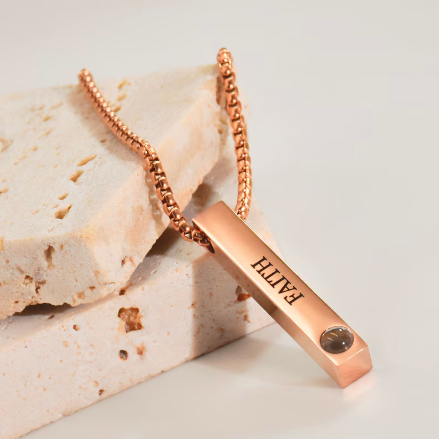 This necklace is designed to celebrate the moments and people that mean the most to you. Whether it's a cherished memory captured in the projection or an important name engraved along the bar, this piece allows you to express yourself in a subtle, elegant way. Ideal as a gift for birthdays, anniversaries, or just because, the custom bar projection necklace is both fashionable and meaningful—a perfect accessory for everyday wear or special occasions.