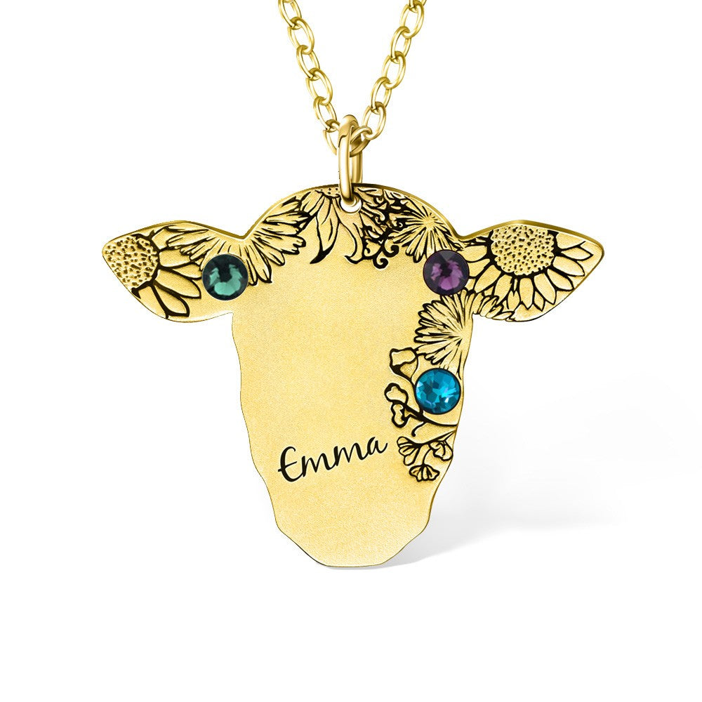 Celebrate your unique style with our Custom Name & Birthstone Cow Necklace, a handmade piece that stands out with its distinctive design and personal touch. This exquisite necklace features a cow head-shaped pendant, intricately adorned with engraved flowers and personalized with your name. Made from either durable stainless steel or luxurious 925 sterling silver, the necklace is available in elegant finishes of 18k gold or 18k rose gold. Each pendant can be customized with up to 8 birthstones, making it a truly unique and meaningful accessory perfect for cowgirls and western lovers alike.