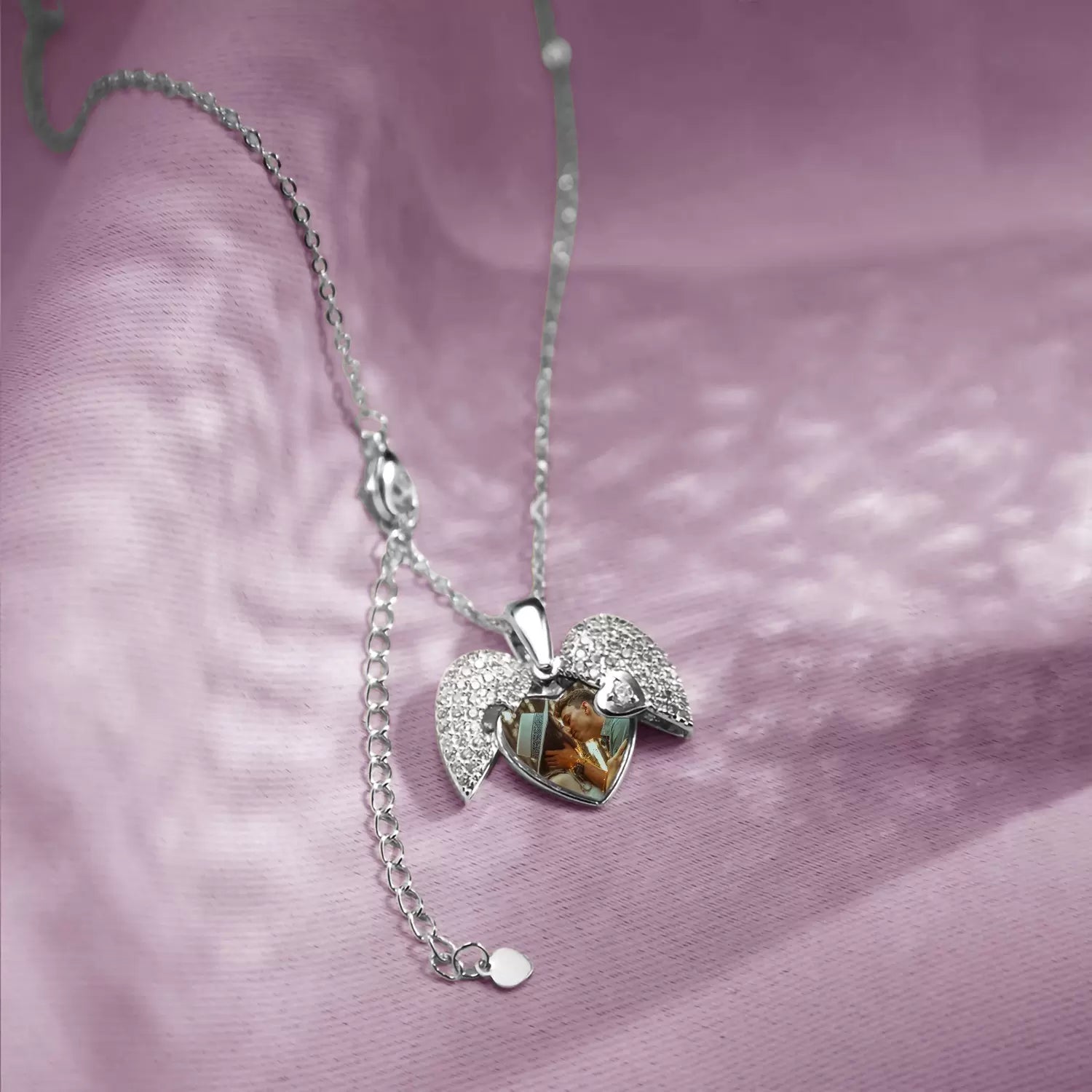 - Features a heart-shaped locket with space for a customizable photo