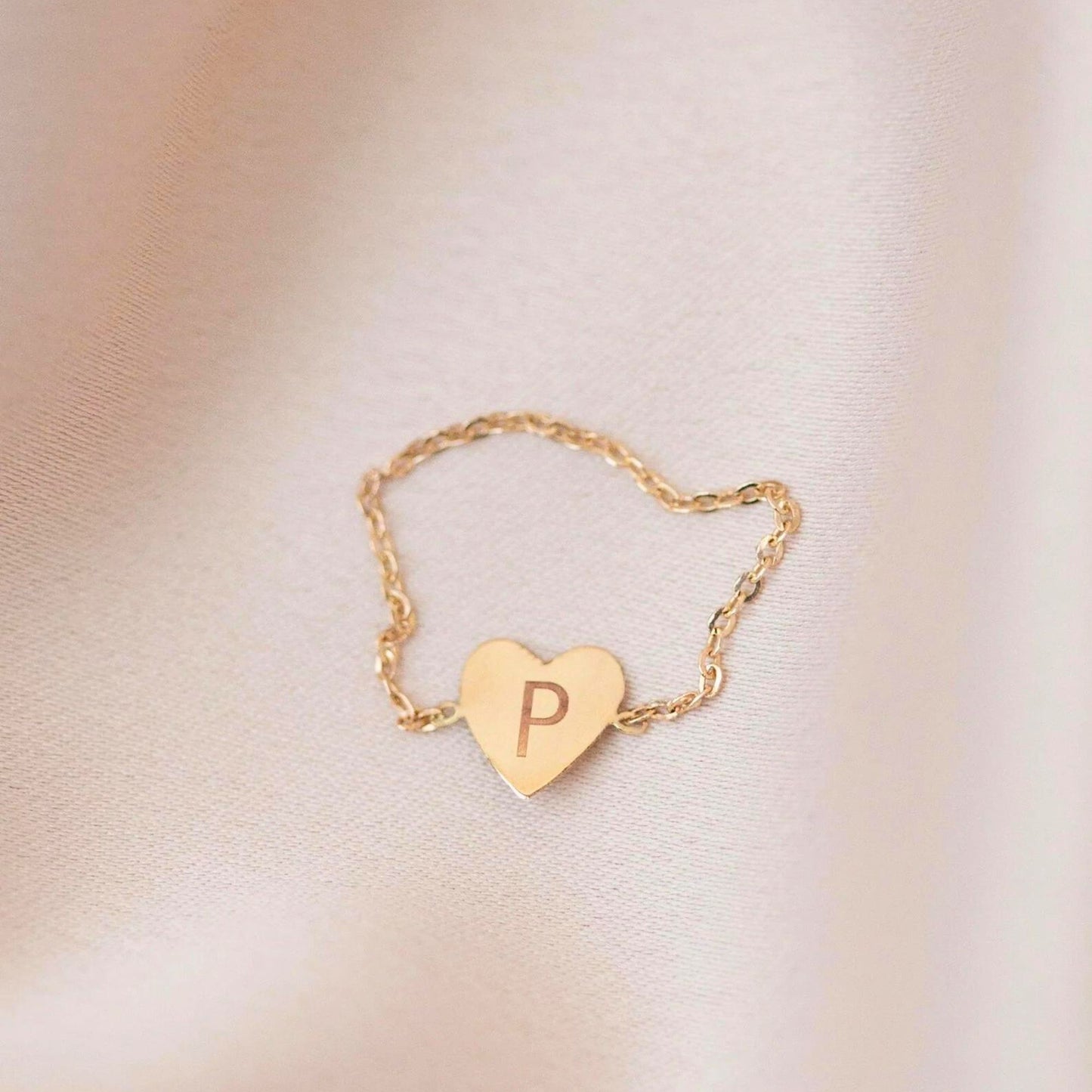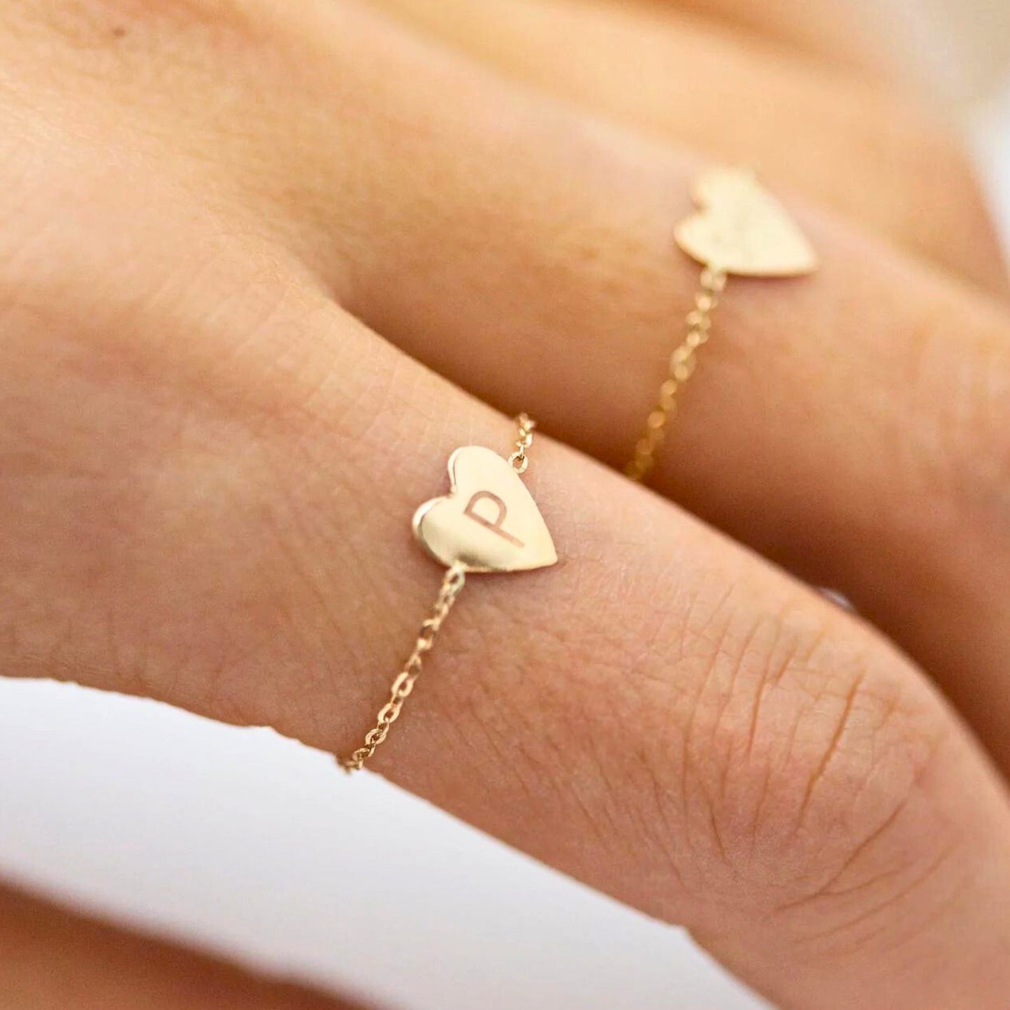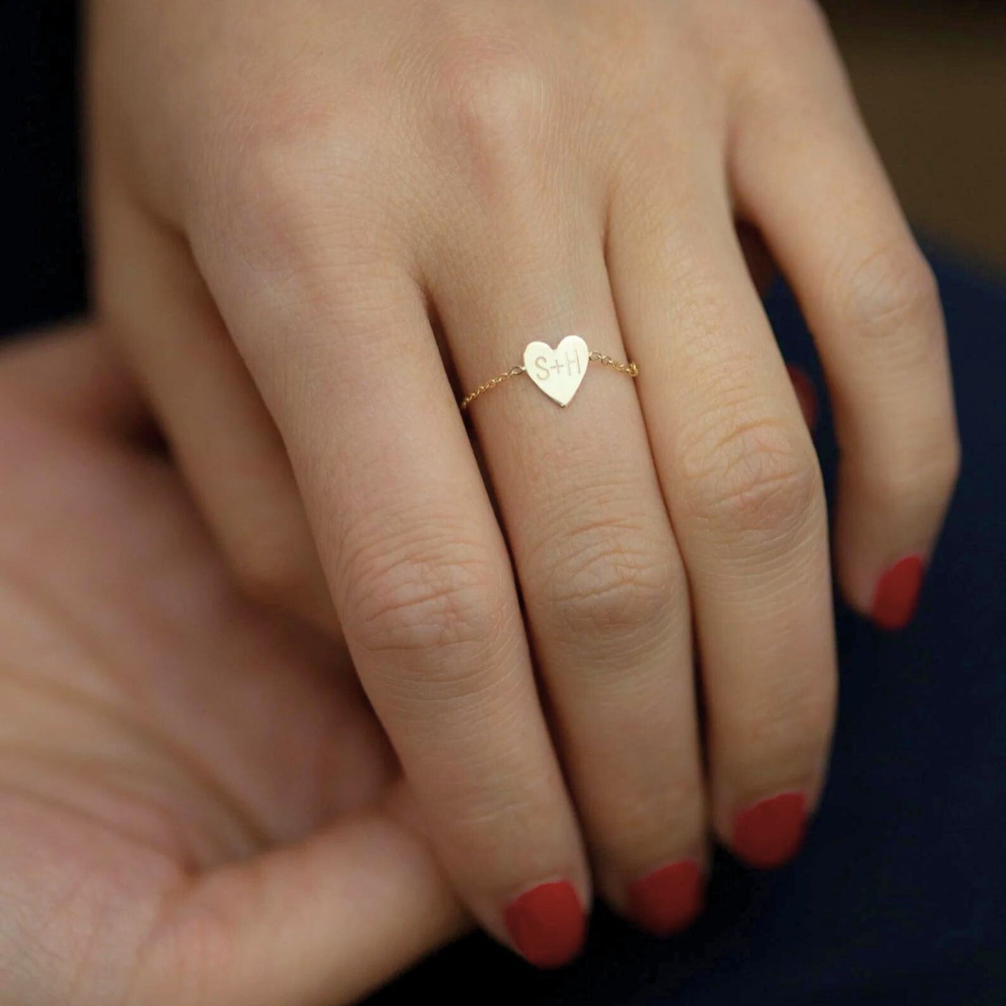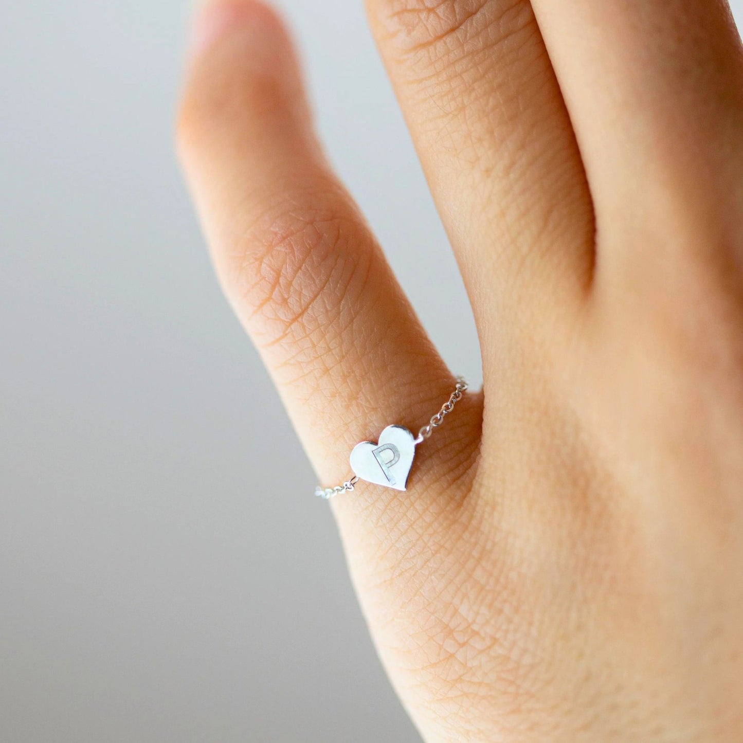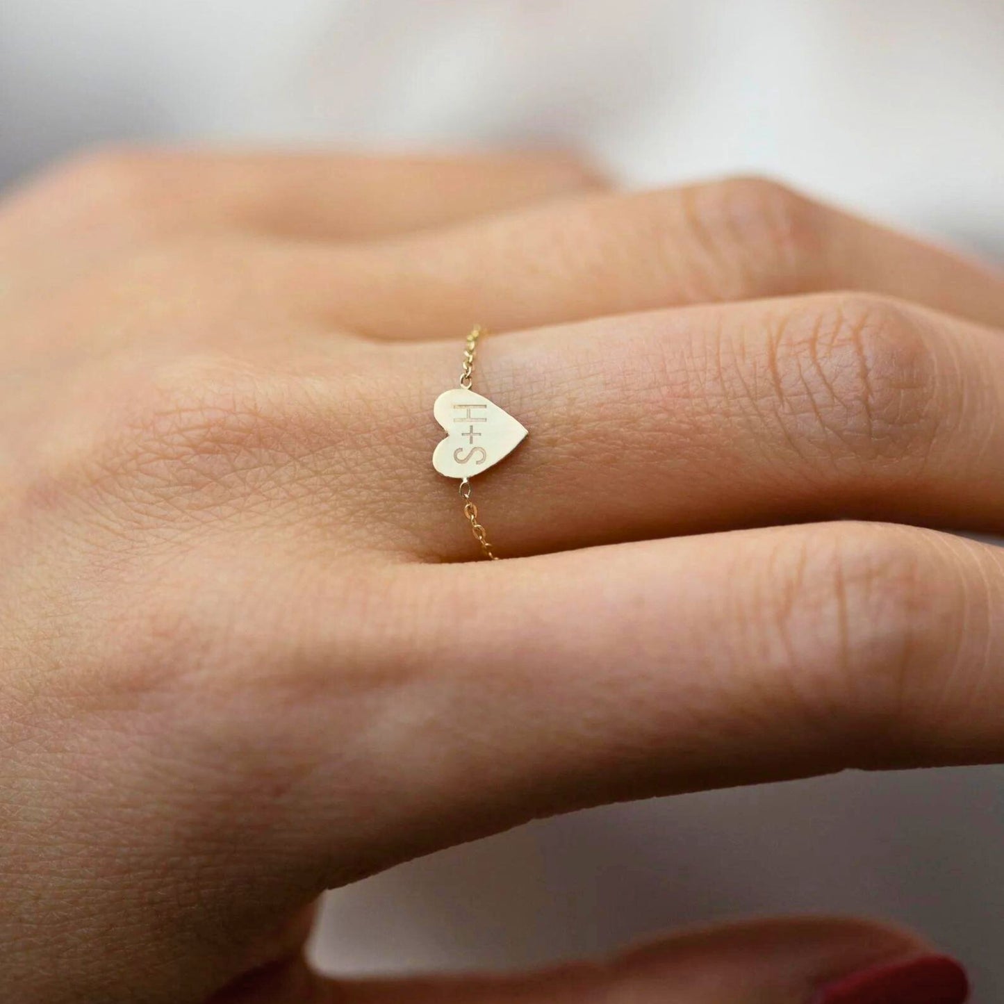 The heart charm is intricately linked to the dainty chain ring, creating a whimsical and romantic design that's sure to capture attention. Whether you choose to showcase your own initials, the initials of loved ones, or meaningful symbols that hold special significance, this ring is a beautiful way to express your individuality and celebrate the bonds of love and friendship.