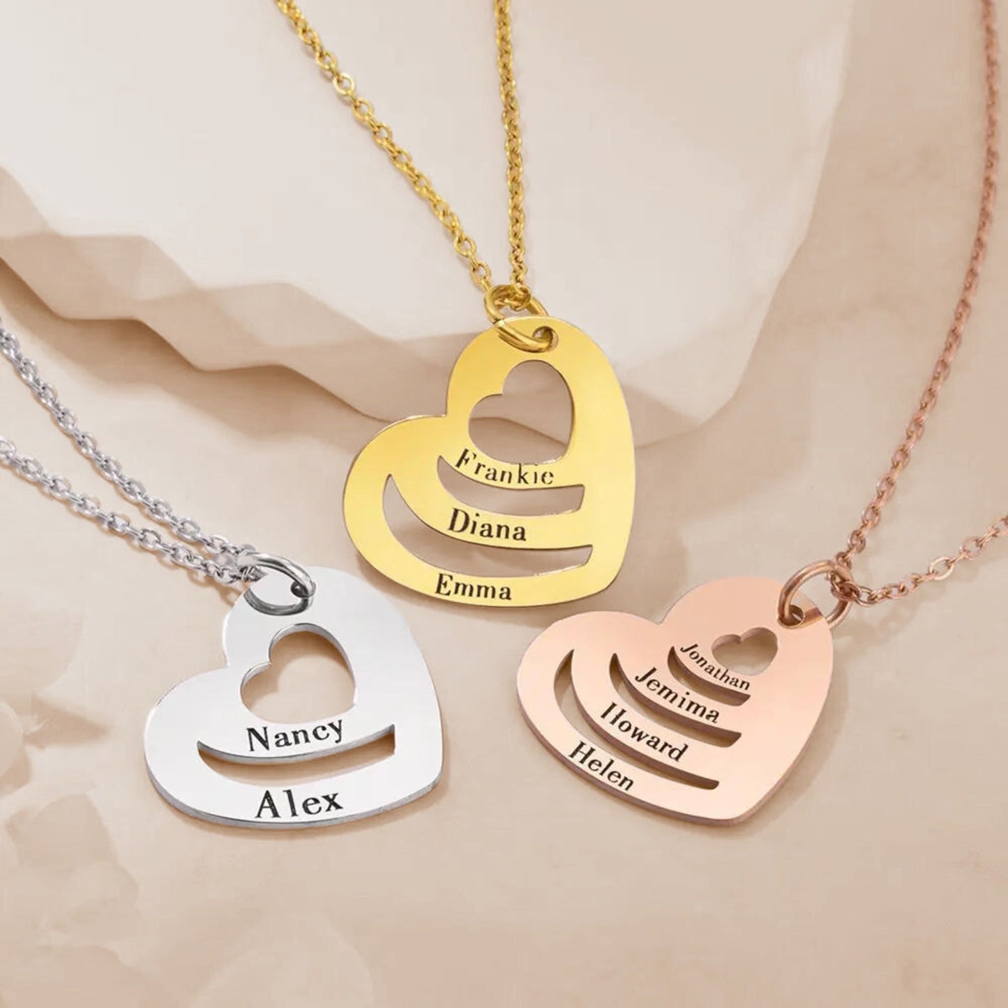 Celebrate the cherished connections in your life with our exquisite Custom Multi-Name Heart Necklace, a heartfelt tribute to the ones you hold dear. Crafted with precision, this necklace features a charming heart-shaped pendant adorned with up to six delicately engraved names, each representing a beloved family member or special someone.