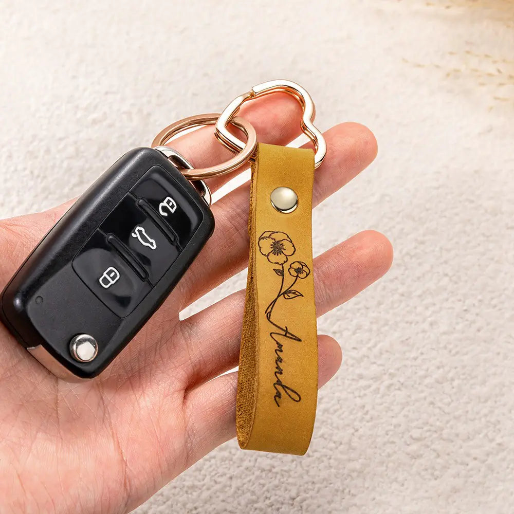 Add a personal touch to your everyday essentials with this custom name birth flower leather keychain. Designed to be both stylish and meaningful, it features your name alongside your birth flower, creating a one-of-a-kind keepsake that celebrates your individuality. Crafted from high-quality leather, this keychain is durable, timeless, and perfect for adding a touch of personalization to your keys, bag, or backpack.