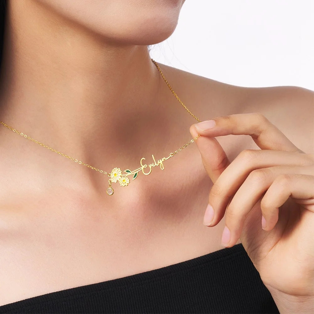 Celebrate your individuality with this custom name birth flower necklace, thoughtfully designed to blend personal identity and natural beauty. Featuring your chosen name alongside a delicate birth flower and a sparkling birthstone, this necklace is a graceful reminder of your unique story and the special moments that define it. It’s a timeless piece that adds both elegance and heartfelt meaning to any jewelry collection.
