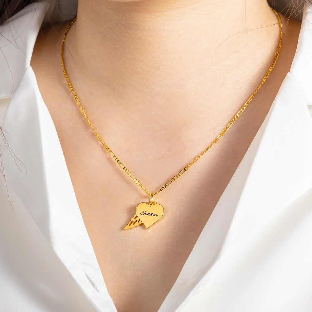 This custom name heart necklace with angel wing beautifully combines heartfelt personalization with a symbol of protection and guidance. The delicate heart holds your chosen name, while the angel wing adds a comforting touch of spiritual care and love. Wearing this necklace is like carrying a guardian angel close to your heart, reminding you or your loved one of strength, hope, and unconditional love.