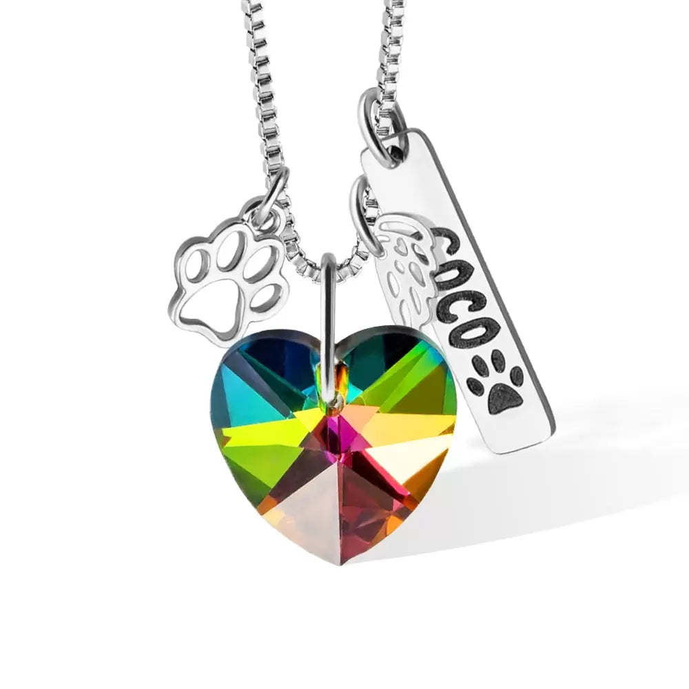Personalize the engraved name charm with your pet's name, elegantly etched to create a lasting tribute to their memory. The crystal pendant adds a touch of sparkle and elegance, symbolizing the enduring bond between you and your furry companion. Available in various crystal colors, you can choose the one that resonates most with your pet's spirit or your personal preference.