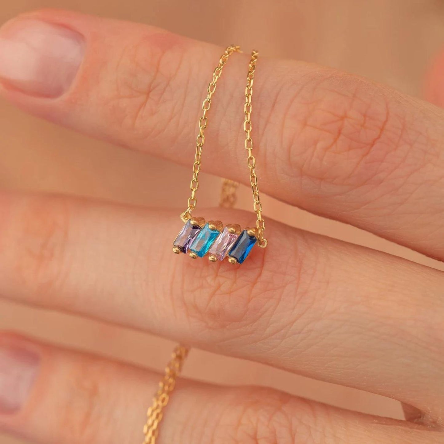The dainty design adds an elegant touch to any ensemble, while the birthstones infuse the piece with personal significance, symbolizing the unique qualities and blessings that each family member brings. Whether worn as a daily reminder of the love that surrounds you or gifted to a loved one as a token of appreciation, this necklace serves as a beautiful celebration of the joy and unity of family.