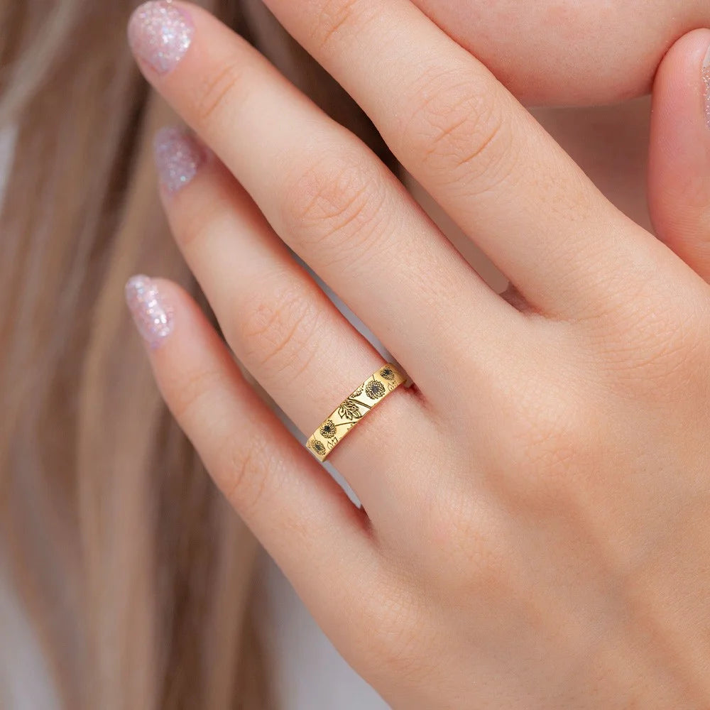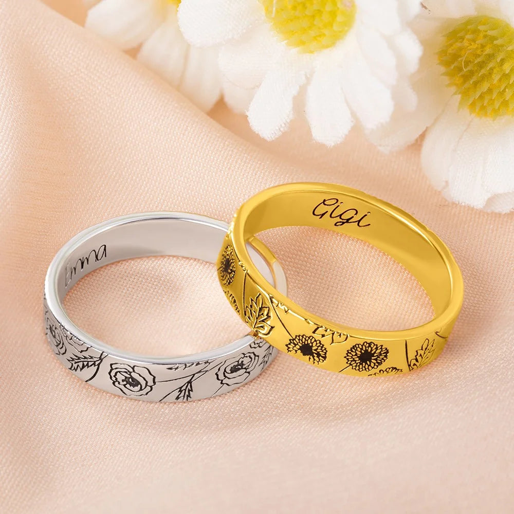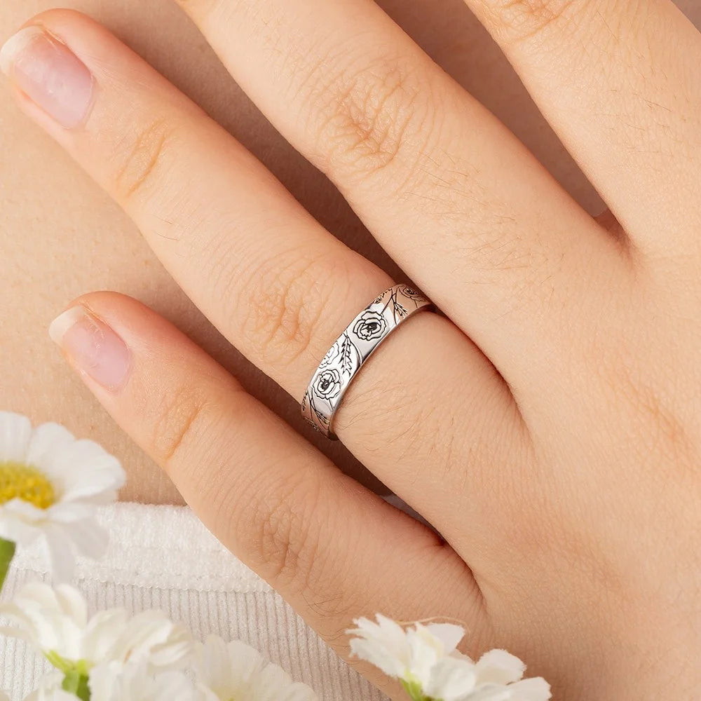Carry the beauty of your loved ones with you in the most delicate way with the engraved combined birth flowers ring. Each flower etched into this piece represents someone dear, blending their meanings and memories into one harmonious design. It’s a subtle, intimate way to celebrate your story, your roots, and the people who make your world bloom.