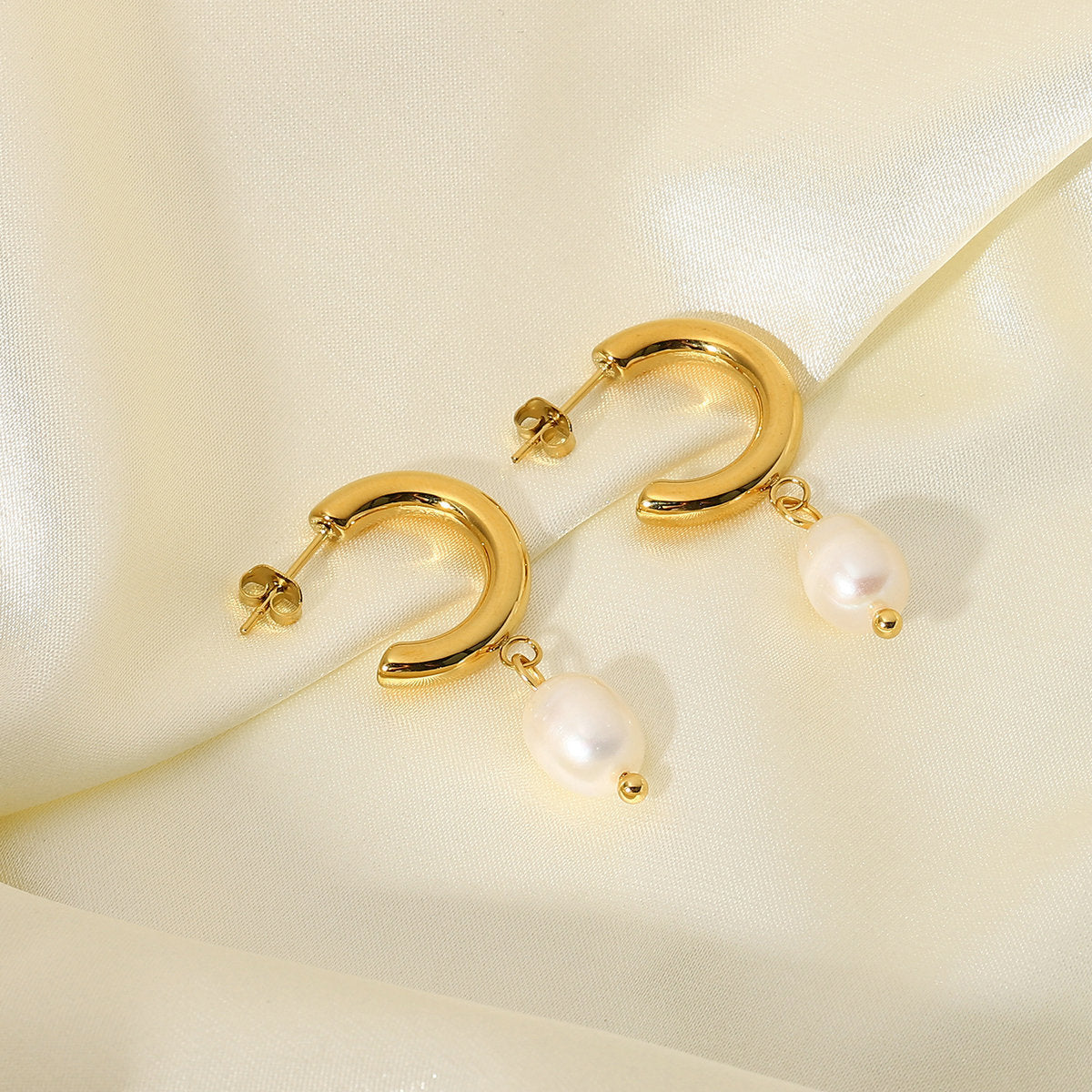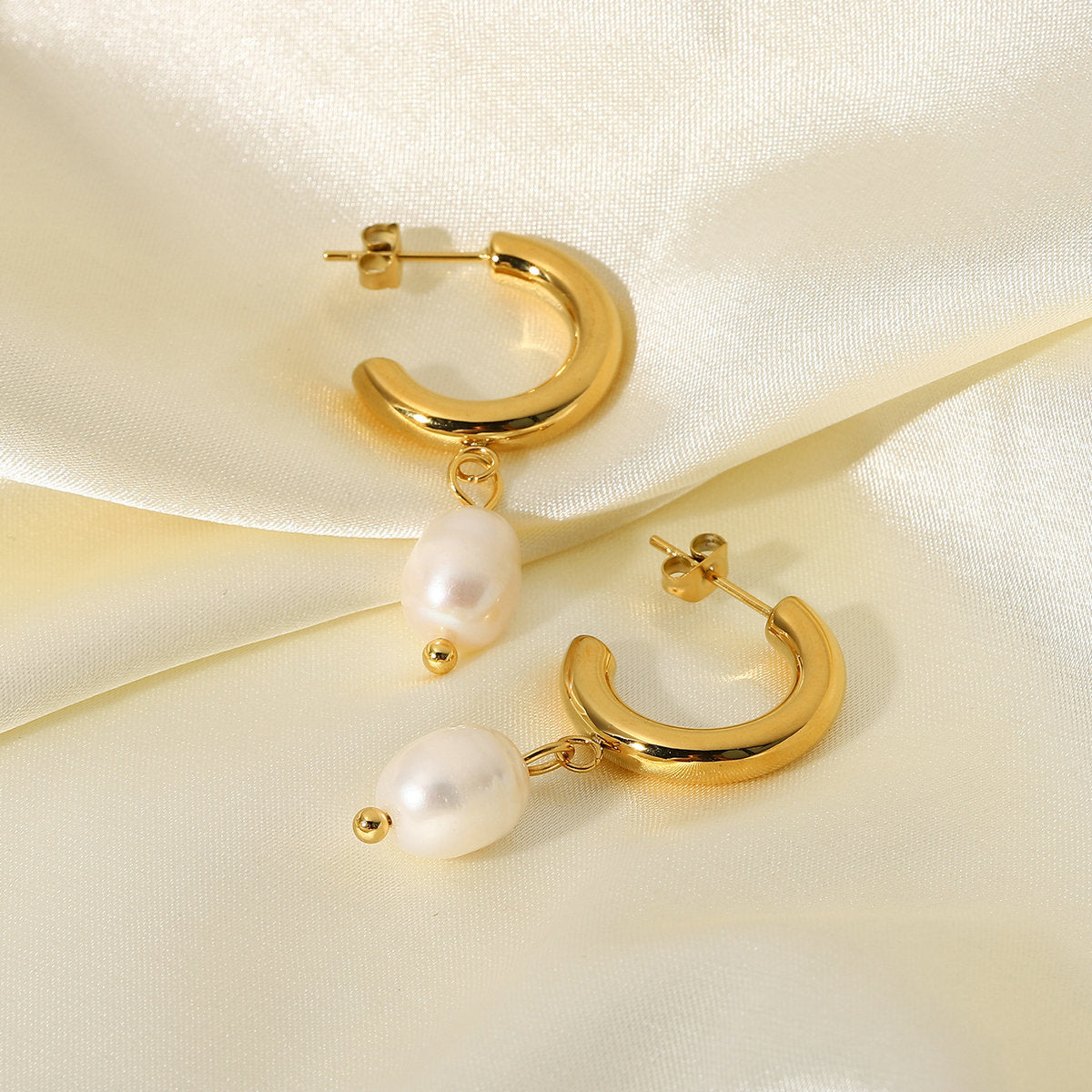 Adorn your ears with a touch of sophistication and natural beauty with our Minimalist Freshwater Pearl Hoop Earrings. Crafted from durable stainless steel and finished with a luxurious 18k gold coating, these earrings boast a dainty hoop design adorned with lustrous freshwater pearls. Their understated elegance makes them the perfect accessory for any occasion.