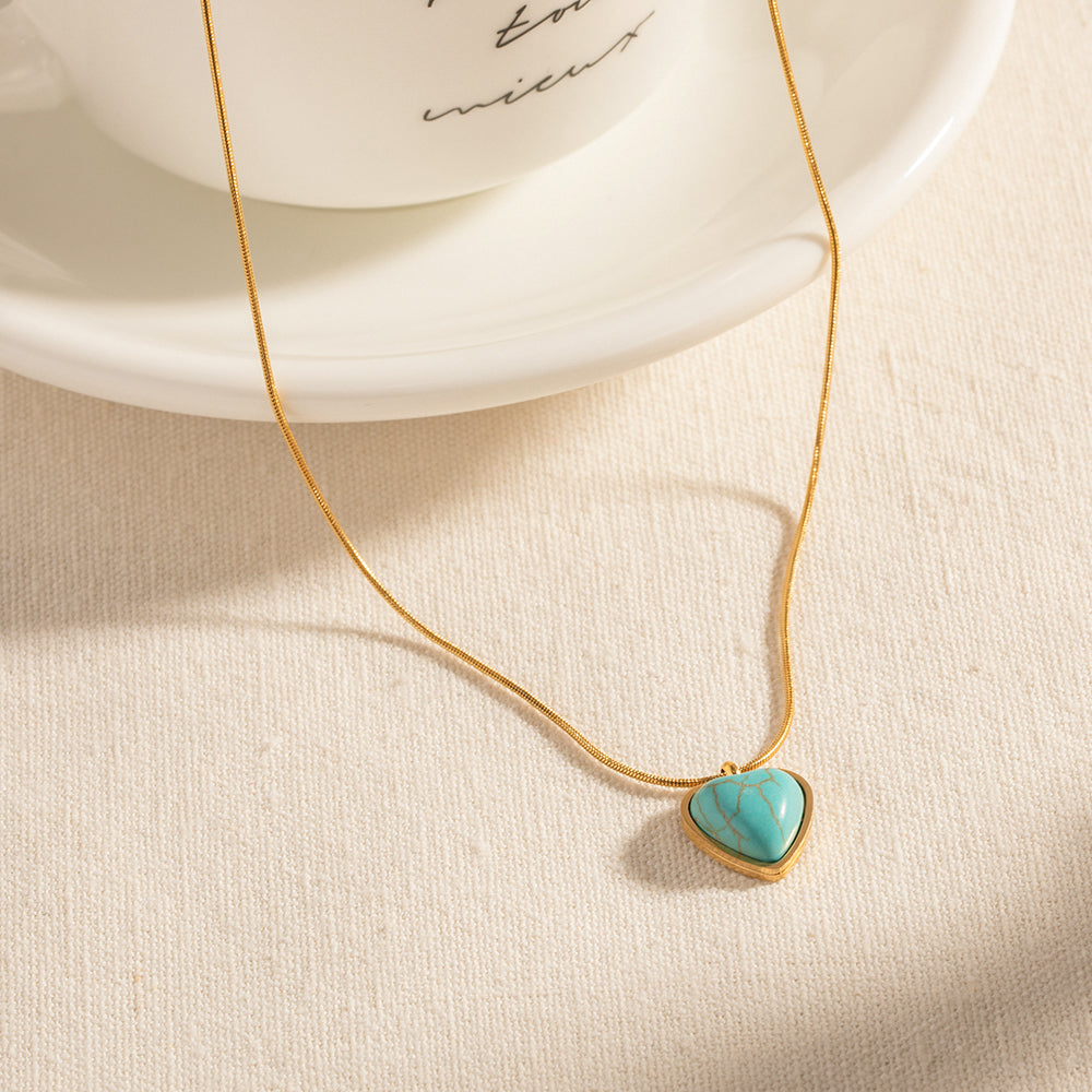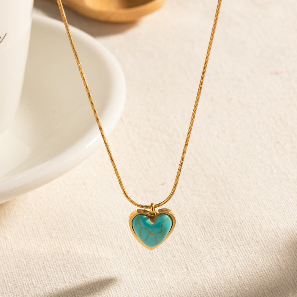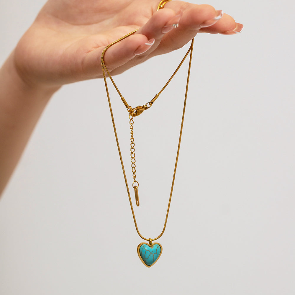 The focal point of this piece is its enchanting heart-shaped pendant, elegantly encrusted with captivating turquoise gemstones. Each turquoise accent infuses the pendant with a serene and calming energy, while the golden finish adds a touch of opulence and warmth.
