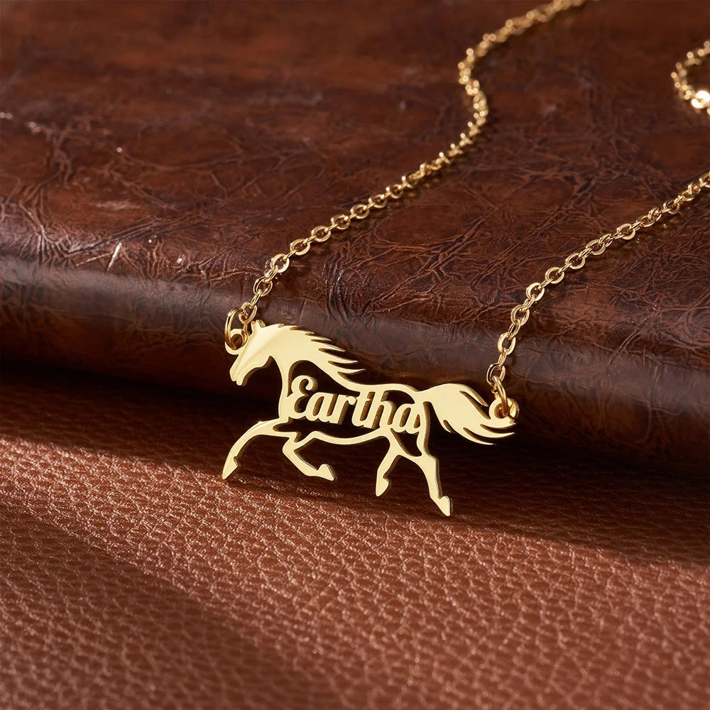 Elevate your equestrian style with this personalized name horse necklace, a sophisticated piece that merges timeless elegance with individual flair. Crafted to showcase your name alongside a graceful horse silhouette, this necklace serves as a meaningful accessory for horse enthusiasts and jewelry connoisseurs alike. The personalization adds a distinctive touch, making it an ideal gift for someone who treasures both equine beauty and bespoke craftsmanship. Versatile enough for everyday wear or special occasions, this necklace combines refined aesthetics with sentimental value.