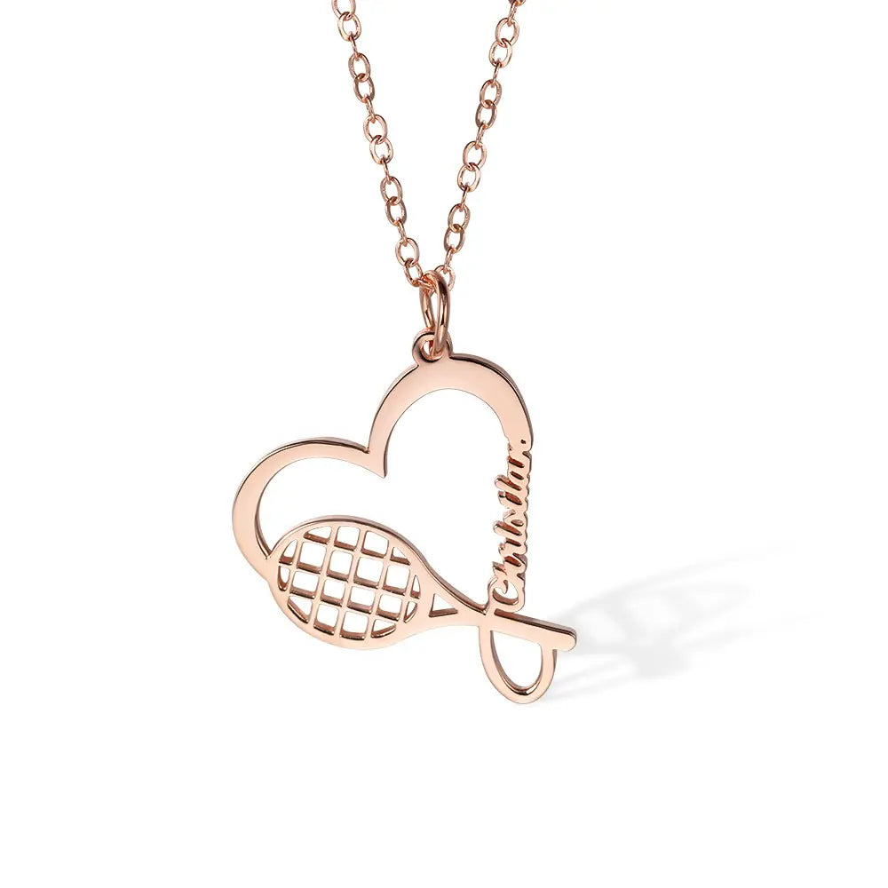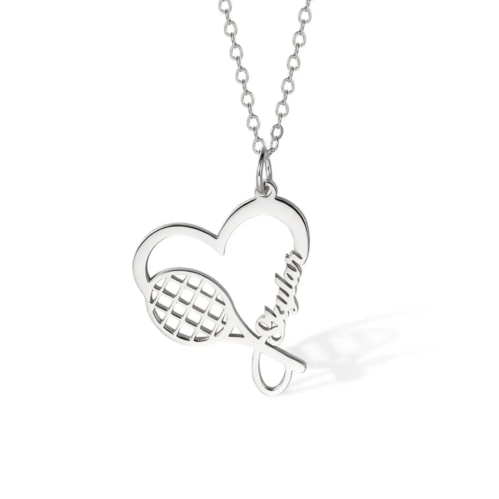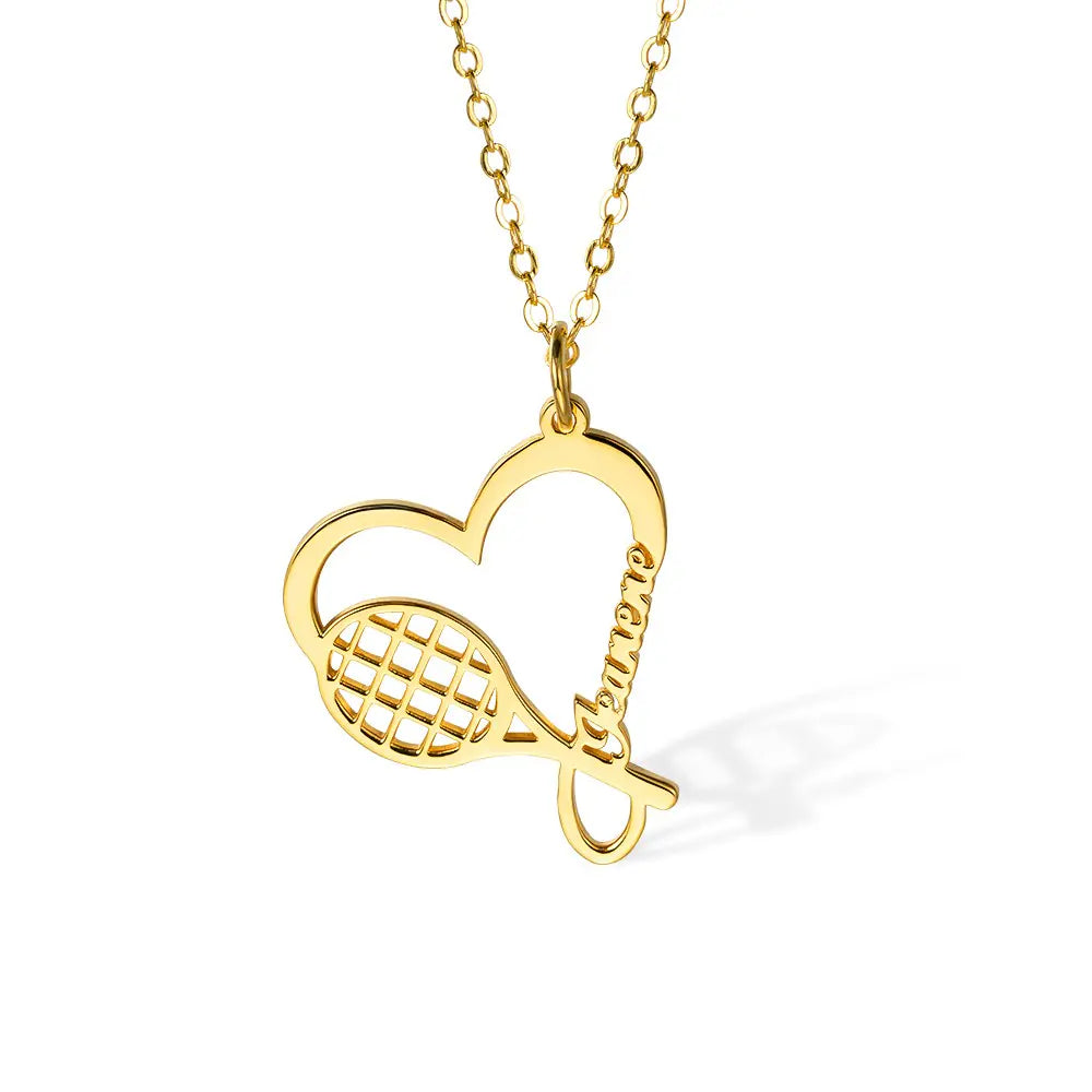 Show off your love for tennis with our Personalized Name Tennis Racket Necklace. This charming piece features a heart-shaped pendant adorned with a detailed tennis racket design. Personalize it by adding your name or the name of someone special, turning it into a unique and stylish tribute to the sport you love. The heart shape adds a touch of elegance and affection, making this necklace a standout accessory that celebrates both your passion for tennis and your personal style.