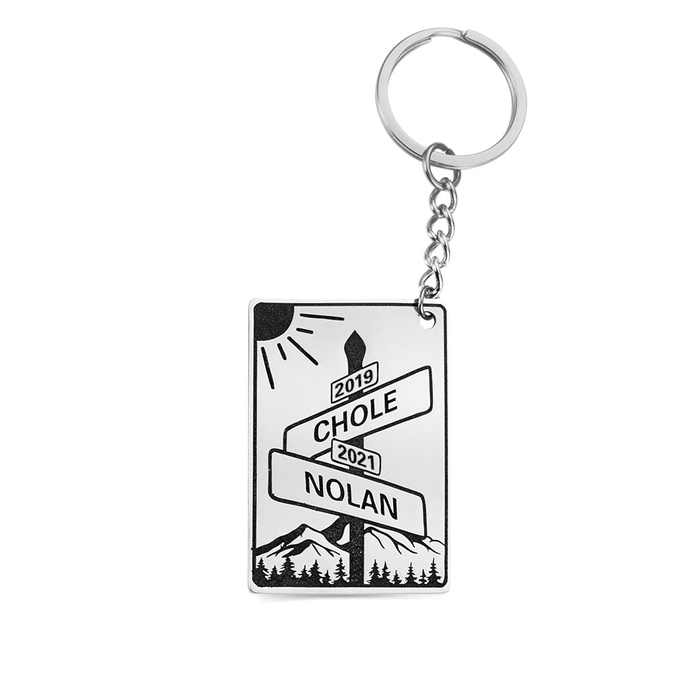 Make your memories even more special with our Personalized Street Sign Keychain. This unique keychain features a street sign design, allowing you to add two names that matter most to you. Whether it's your partner's name, your children's, or a meaningful duo, this keychain is custom-made to hold those special bonds. On the back, a custom message and important dates can be engraved, adding a personal touch to every detail.