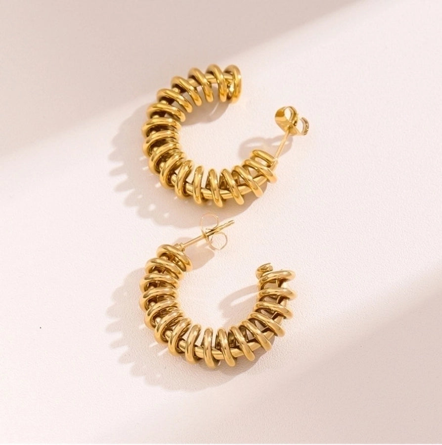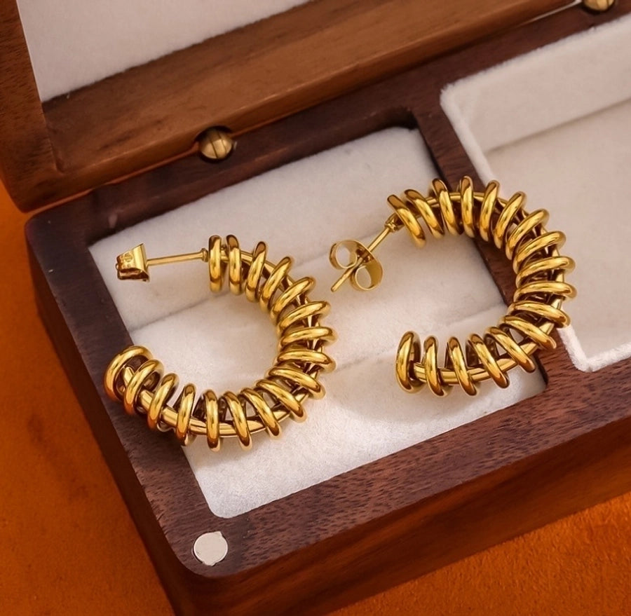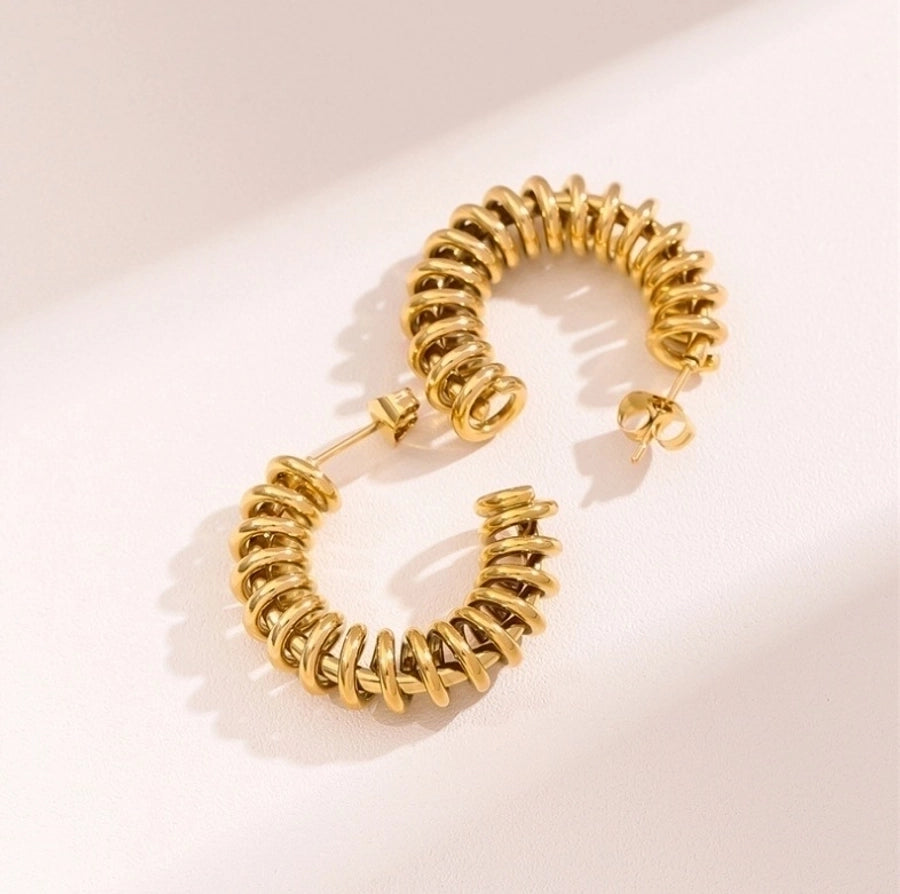 The Spring Twist Hoop Earrings bring a fresh and playful twist to a classic design. Made from durable stainless steel with a luxurious 18k gold finish, these earrings are both stylish and sturdy, perfect for everyday wear or special occasions. The unique twisted design adds a contemporary flair, making them a standout accessory that will enhance any outfit.