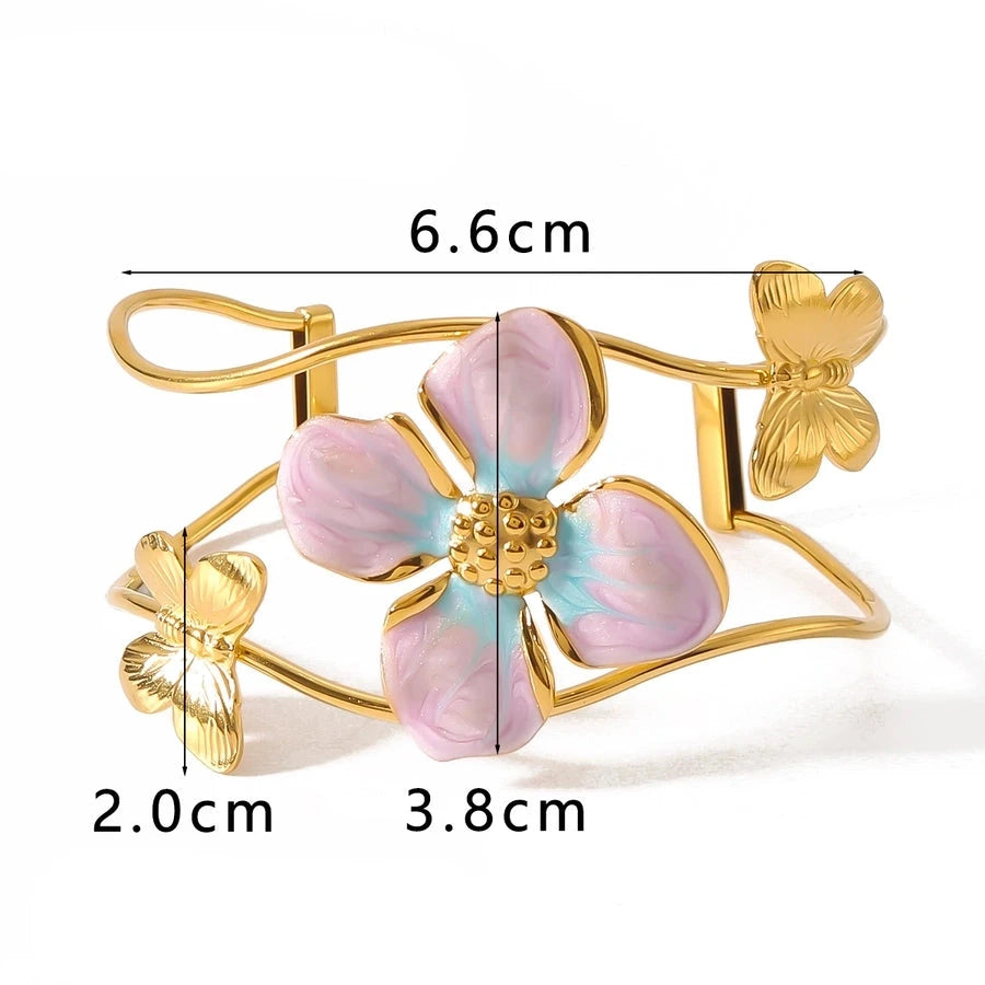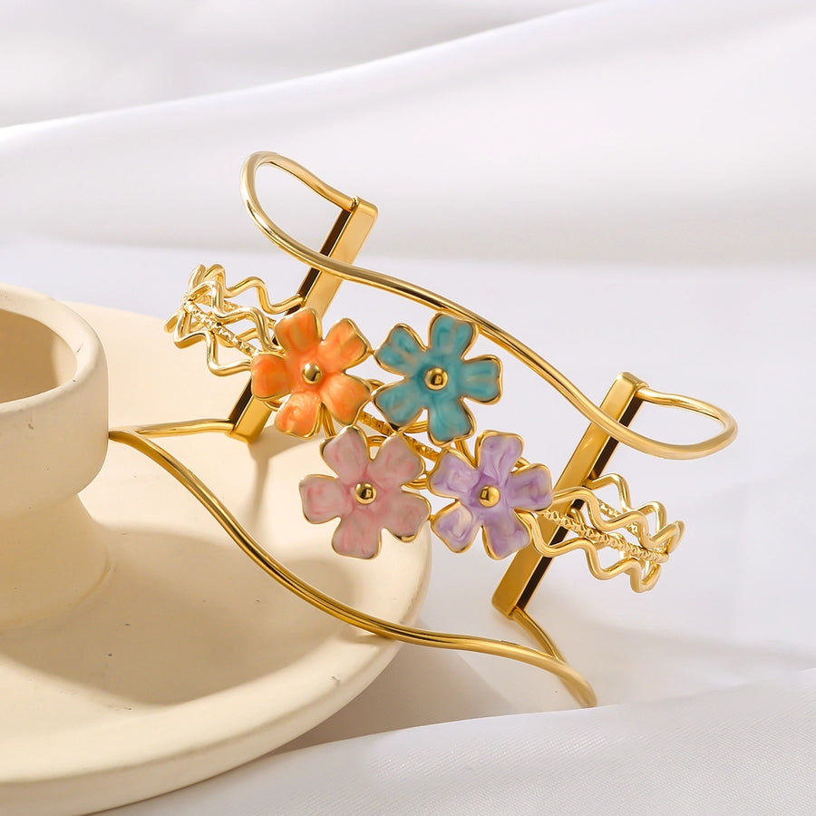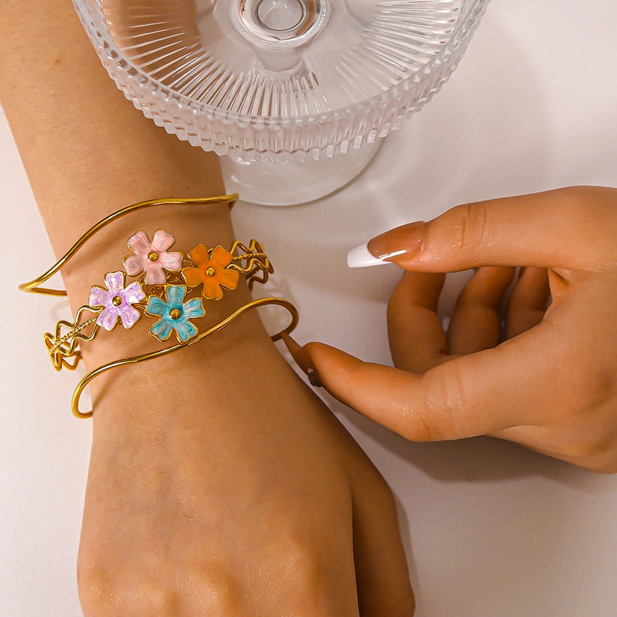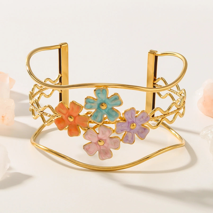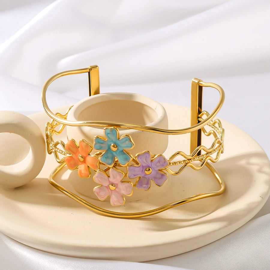 The Vintage Flower Art Cuff Bracelet is a captivating piece that beautifully marries classic design with modern artistry. Crafted from durable stainless steel with a luxurious 18K gold finish, this cuff bracelet features exquisite enamel detailing in three stunning designs, each showcasing a unique floral motif. Its bold yet elegant aesthetic makes it a standout accessory for any outfit, whether you're dressing up for a special occasion or adding flair to your everyday look.