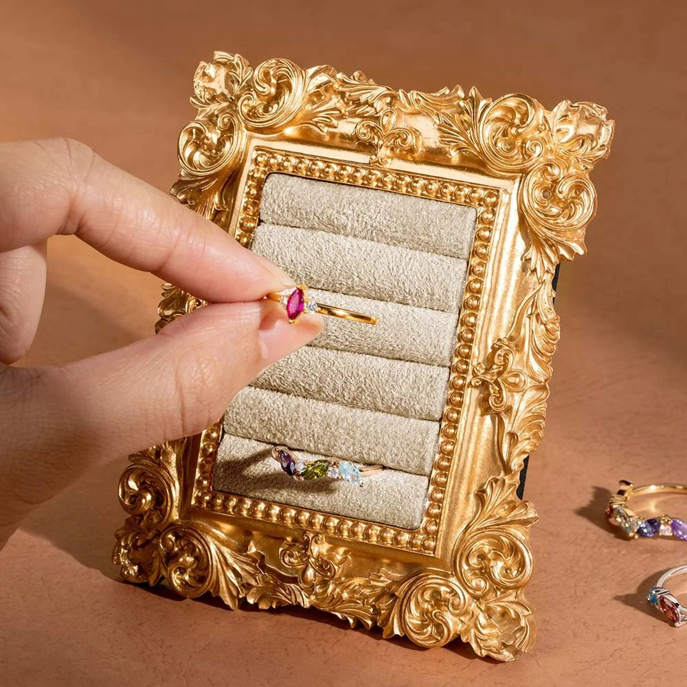 Showcase your most treasured rings with timeless elegance. This vintage-inspired display frame features five dedicated slots, each designed to securely hold and beautifully present your collection. Perfect for jewelry enthusiasts, collectors, or as a sophisticated gift, it combines functional storage with decorative appeal. The classic aesthetic complements any décor style while keeping your favorite pieces organized and easily accessible. An ideal solution for those who appreciate both organization and visual presentation.